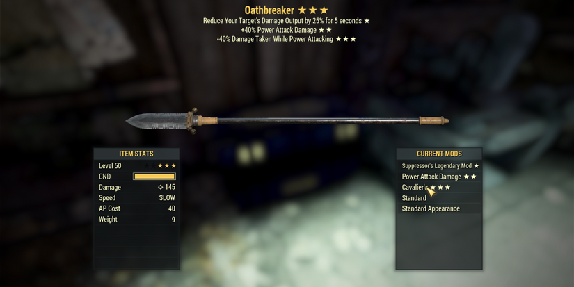 El Oathbreaker es un arma cuerpo a cuerpo de dos manos, muy similar a una lanza, que puede ser caído en diferentes niveles como se muestra en la tabla de estadísticas a continuación, dependiendo de cuándo completes la misión en tu Fallout 76 viaje: