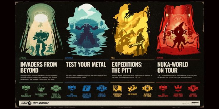Bethesda ha revelado la hoja de ruta de 2022 para Fallout 76 que parece ser bastante expansivo con contenido nuevo y actualizaciones de calidad de vida, como nuevas configuraciones de PVP. Dado el nivel de calidad de Fallout 76Las actualizaciones estacionales existentes deberían entusiasmar a los jugadores. Esta primavera, Bethesda agregará el Invasores del más allá evento de temporada que agregará ovnis y extraterrestres en todo el mapa. En el verano, el nuevo Pon a prueba tu metal la actualización introducirá la Pon a prueba tu metal, Notificación de desalojoy Jamboree de alcohol ilegal eventos publicos. El otoño contará con el regreso de Fallout 3‘s The Pitt, que lleva a los jugadores fuera de Appalachia para misiones que presentan árboles de diálogo y nuevos NPC. Finalmente, en el invierno, un roadshow de Nuka-World llegará a Appalachia con nuevo botín, eventos públicos y un nuevo jefe de región.