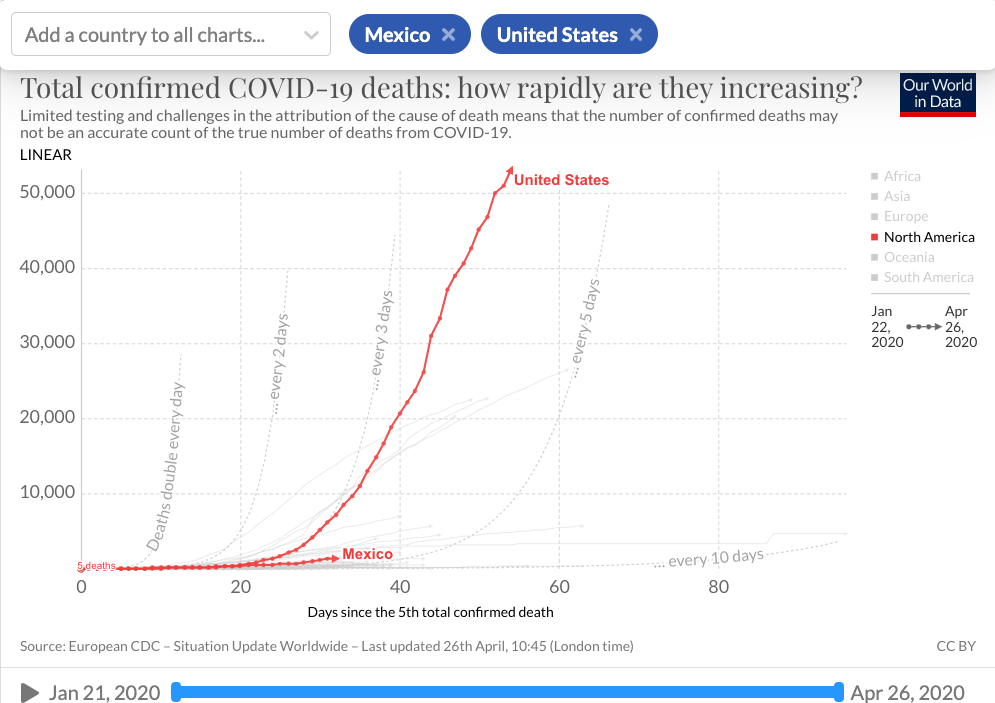Pero de esta forma, obtiene números alarmantes: al 24 de abril, México hubiera ido ya en el día 56 de su epidemia, con más de mil muertos, y Estados Unidos, en su mismo día 56, llevaba menos de 100 muertos.