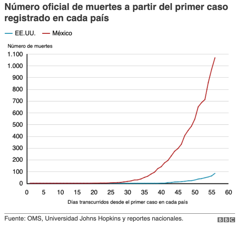 BBC News Mundo publicó un artículo de su corresponsal en México Marcos González Díaz (@soymarcosgd) que dice que la pandemia va mucho, mucho peor en México que en Estados Unidos, considerando la etapa en la que cada uno de ellos está.