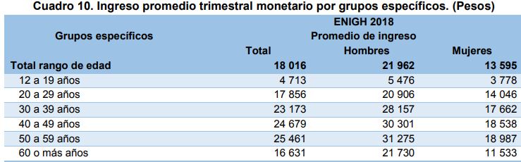 Según grupos de edad, el mayor ingreso promedio corresponde al grupo de 50 a 59 años con 25 mil 461 pesos y el menor ingreso al grupo de edad de 12 a 19 años con 4 mil 713 pesos.