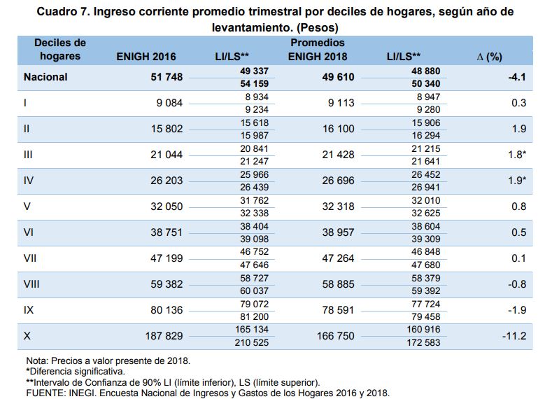 Expuso que la brecha entre estos deciles es menor a la que se registró en la ENIGH 2016, cuando el primer decil tuvo ingresos por 9 mil 084 pesos y el décimo decil de 187 mil 829 pesos, con lo cual este último obtuvo 21 veces más ingresos.