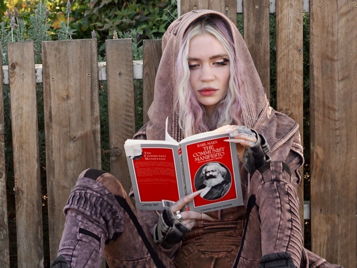 El pasado fin de semana unas imágenes de Claire Elise Boucher, la artista conocida popularmente como Grimes, se hicieron virales. Las fotos, cazadas por una agencia de paparazis dedicada exclusivamente a producir imágenes de famosos (Backgrid), no tenían desperdicio: ahí estaba la cantante, vestida como si saliera de la nueva adaptación de Dune, leyendo concienzudamente El manifiesto comunista. Una imagen que pedía a gritos titulares tan jugosos como el que le dio Page Six, el tabloide estadounidense: “Grimes vista leyendo a Karl Marx tras romper con el hombre más rico del mundo, Elon Musk”.