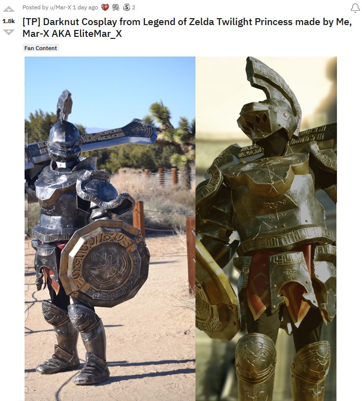 La usuaria de Reddit y cosplayer Mar-X 1, que anteriormente publicó cosplays impresionantes de personajes como de Mortal Kombat Cyber Sub-Zero, recientemente compartió algunas imágenes de su versión de La Leyenda de Zelda: La Princesa del Crepúsculo es nuez oscura r/Zelda. Este cosplay se basa en la forma completamente blindada de Darknut, particularmente en el encuentro de Link y Midna en el Templo del Tiempo. En la sección de comentarios, Mar-X 1 explica que hizo la armadura de Darknut con espuma EVA, mientras que la falda con forma de falda escocesa debajo de la armadura del caballero es de vinilo. Continúa diciendo que le gustaría poder hacer el disfraz de metal, pero señala que está satisfecho con el resultado final de todos modos.