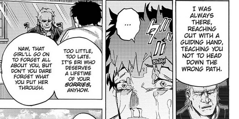 El capítulo también se tomó su tiempo para finalmente permitirle a Kai Chisaki/Overhaul la oportunidad de hablar con su Jefe una vez más, aunque la reunión no fue todo lo que Chisaki soñó. El Jefe reprendió a Chisaki por su egoísmo y estupidez, y se horrorizó cuando escuchó lo que Chisaki le hizo a Eri. El Jefe declaró su intención de “tomar [Chisaki] “a la tarea” por el resto de su vida, presumiblemente asegurando que Chisaki nunca olvidaría las cosas horribles que hizo, tanto en general como a Eri en particular. Se siente como un insulto final para posiblemente el villano más odiado en Mi academia de héroe.