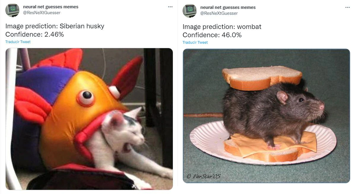 La red neuronal que emplea el bot, ResNeXt, es una de las candidatas presentadas en 2017 a la competición que cada año organiza el proyecto ImageNet, centrado en la creación de una base de datos de imágenes etiquetadas que puedan utilizarse, por ejemplo, para la investigación sobre sistemas de visión artificial. “Después de graduarme, cuando por fin tuve tiempo para trabajar en algunos proyectos personales, estuve experimentando con la arquitectura de ResNeXt, era interesante ver cómo incluso al pasar memes aleatorios por el sistema podías entender la lógica que la red neuronal estaba usando en su clasificación”, comenta el ingeniero. Aquellas pruebas le dieron la inspiración necesaria para crear un bot de Twitter que publicase un meme y una predicción cada pocas horas.