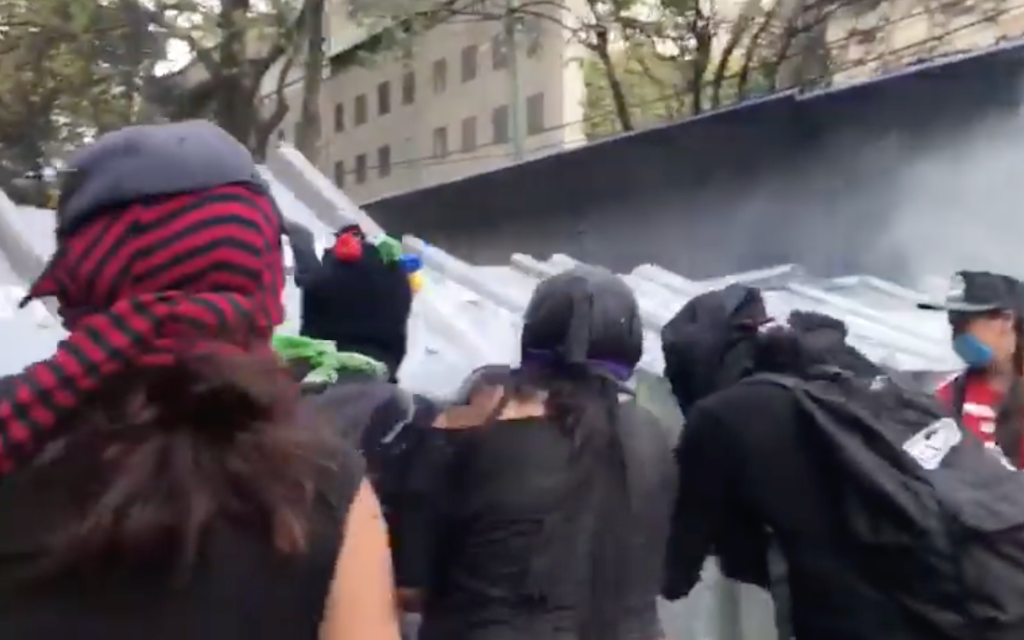 De acuerdo con La Octava, las manifestantes, quienes se encuentran encapuchadas agreden con martillos los escudos de las mujeres policías que resguardan la protesta.