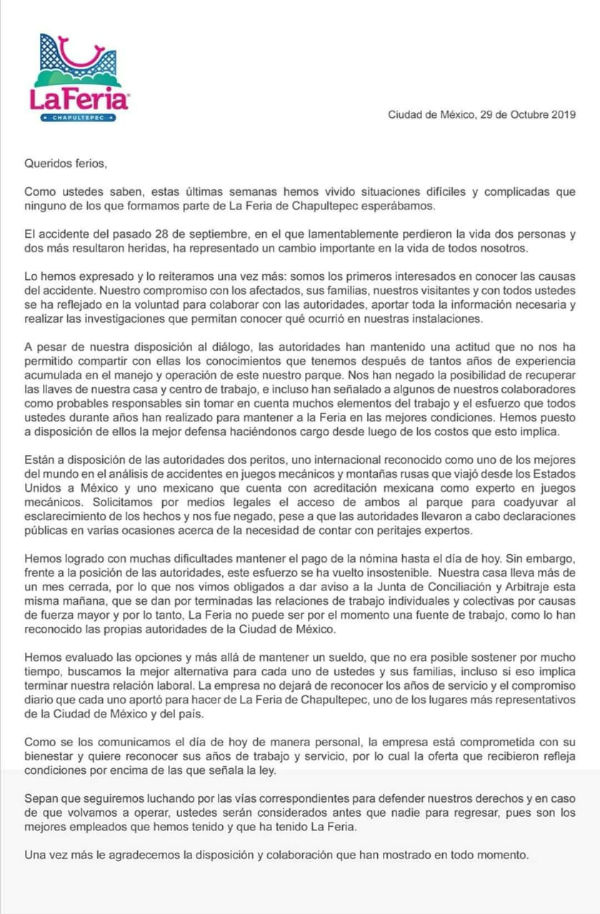 La Feria de Chapultepec despidió a todos sus trabajadores ante la imposibilidad de seguir pagando sus sueldos luego de un mes de permanecer cerrada, debido a la muerte de dos personas ocurrida en el parque de diversiones el pasado 28 de septiembre.