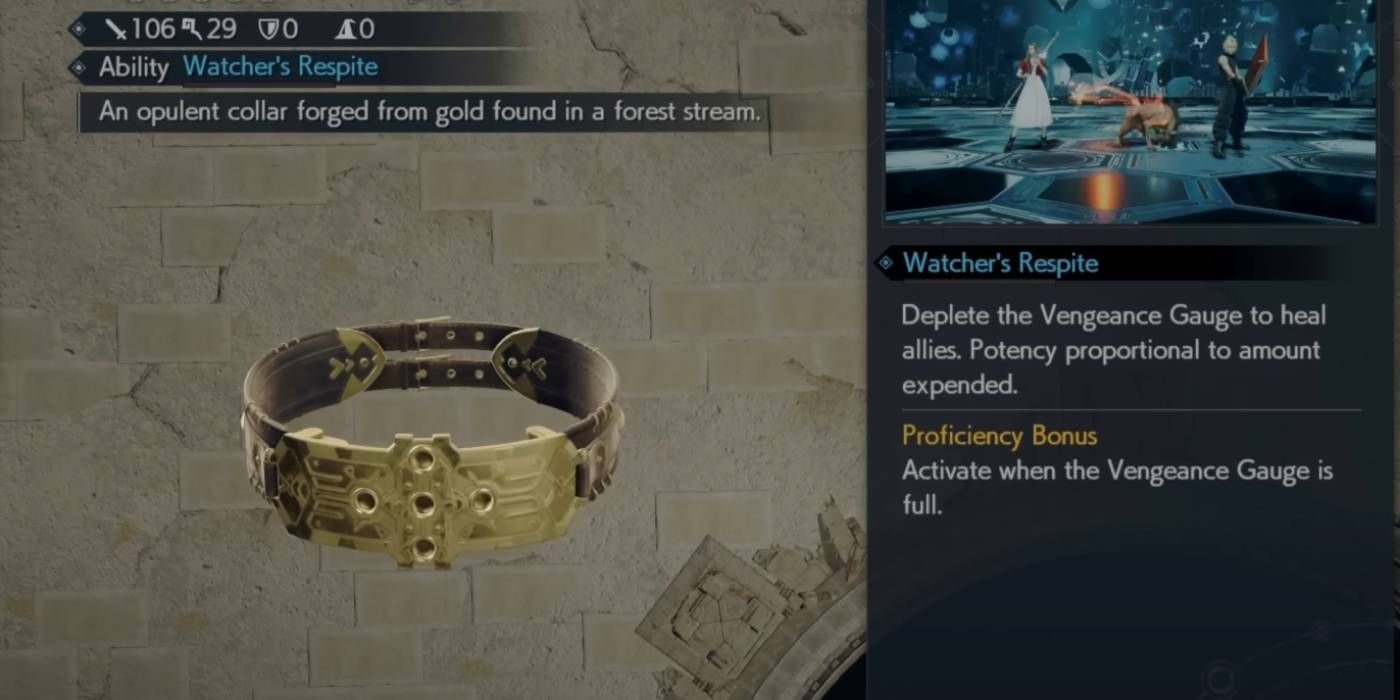 Ser capaz de curar a los aliados siempre es importante en batallas frenéticas con tu grupo, por lo que el Collar dorado El arma para Red XIII tiene la habilidad perfecta para apoyar a tus aliados. Al proporcionar curación a cambio de Vengeance Gauge, sacrificas el singular impulso de poder de Red XIII para ayudar a tus compañeros de equipo. Hacer esto mientras Vengeance está lleno podría restaurar en gran medida el HP de todos sin tomar tanto tiempo como usar Healing Materia.