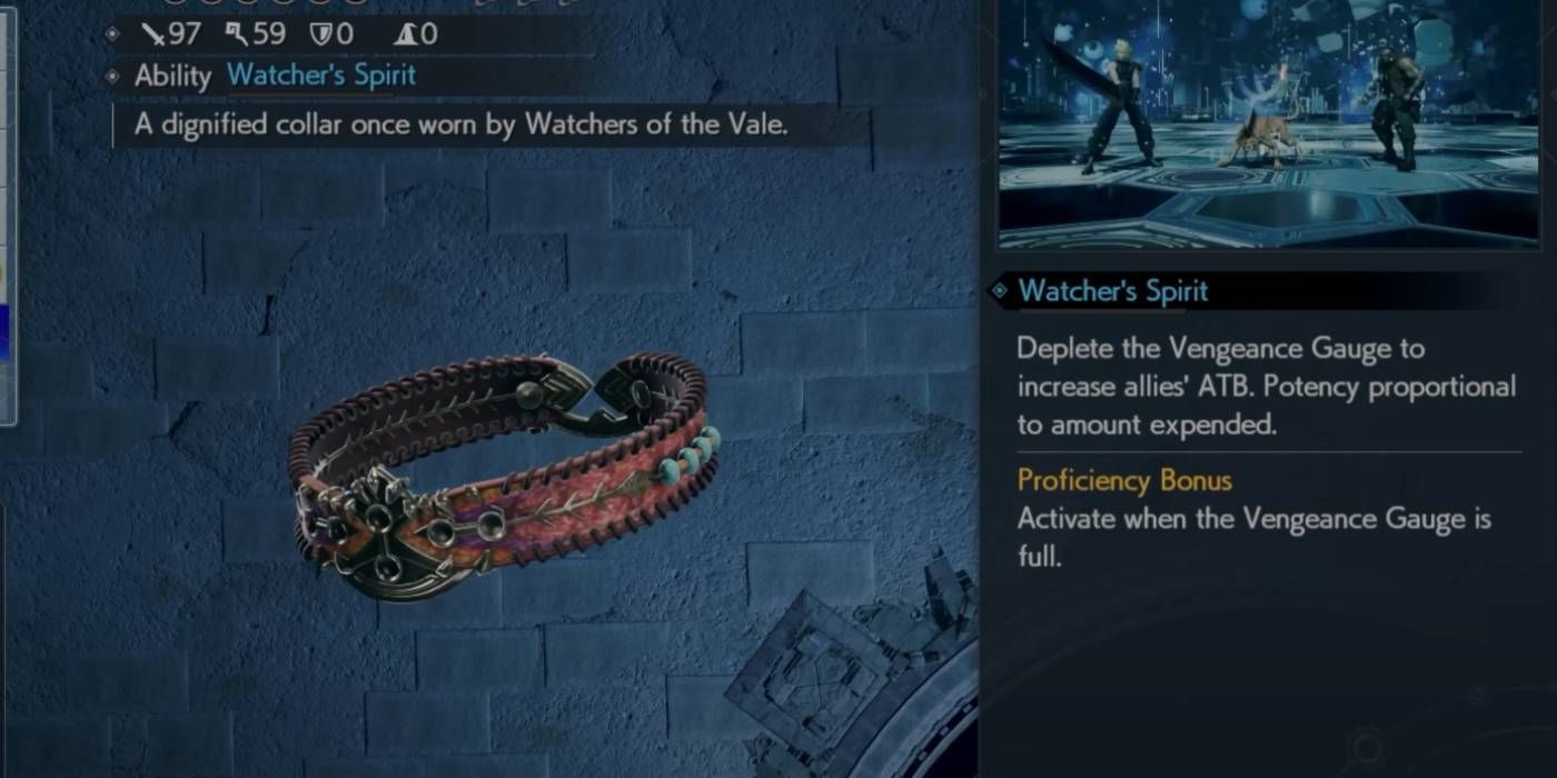 Cuanto más indicador de venganza gastes, mayor será la cantidad de ATB que otorgarás a tus aliados en la batalla. Intenta construir la mayor cantidad de calibre posible antes de gastarlo en Watcher’s Spirit para que tu grupo pueda llenar ambas barras de ATB casi de inmediato. La mejor arma para Red XIII en Final Fantasy 7 Renacimiento ofrece una recompensa aún mayor por utilizar la mecánica de combate distintiva de este personaje de lo que normalmente verías.