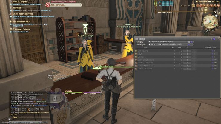 Los otros tipos de elementos son un poco más directos. Master Recipe Nine Aethersand relacionados se pueden comprar en Scrip Exchange NPCs por 200 Purple Gatherer Scrips por pieza. Se pueden recibir artículos de aforismo de Cihanti en Radz-at-Han bajo su opción “” Othe “. Cada ingrediente individual cuesta 20 Tomestones of Aphorism. En la mayoría de los casos, los elementos del Aforismo deben elaborarse con los elementos del Folklore Regional para hacer los materiales finales mencionados anteriormente.