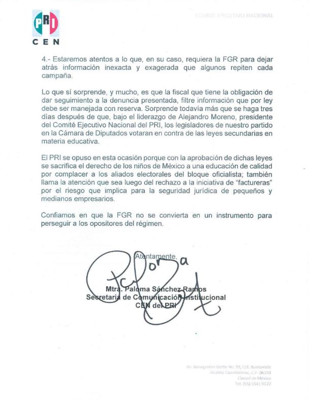 Y criticó el actuar del fiscal por filtrar información. “Sorprende todavía más que se haga tres días después de que, bajo el liderazgo de Alejandro Moreno, presidente del Comité Ejecutivo Nacional del PRI, los legisladores de nuestro partido en la Cámara de Diputados votaran en contra de las leyes secundarias en materia educativa”.