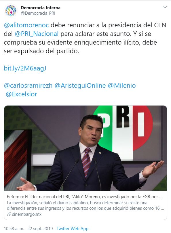 Por su parte, la corriente Democracia Interna del PRI, encabezada por el priista Ulises Ruiz, exigió la renuncia del presidente nacional de ese partido, Alejandro Moreno Cárdenas, para que aclare su presunto enriquecimiento ilícito exhibido en la adquisición de 16 inmuebles en Campeche.