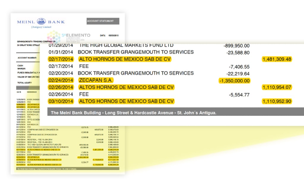 Un mes después Altos Hornos de México, propiedad del empresario Alonso Ancira, transfirió más de 3 millones 700 mil dólares a las cuentas de Grangemouth Trading Company, firma offshore de la constructora Odebrecht, desde la cual también se distribuyeron decenas de millones de dólares para sobornar a la élite política de los países en los que la empresa brasileña tenía operaciones.