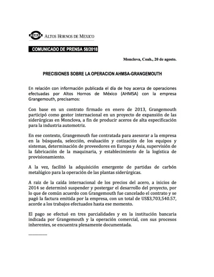 Sin embargo, según Altos Hornos de México, “Grangemouth participó como gestor internacional en un proyecto de expansión de las siderúrgicas en Monclova, a fin de producir aceros de alta especificación para la industria automotriz” y “fue contratada para asesorar a la empresa en la búsqueda, selección, evaluación y cotización de los equipos y sistemas, determinación de proveedores en Europa y Asia, supervisión de la fabricación de la maquinaria, y establecimiento de la logística de provisionamiento”.
