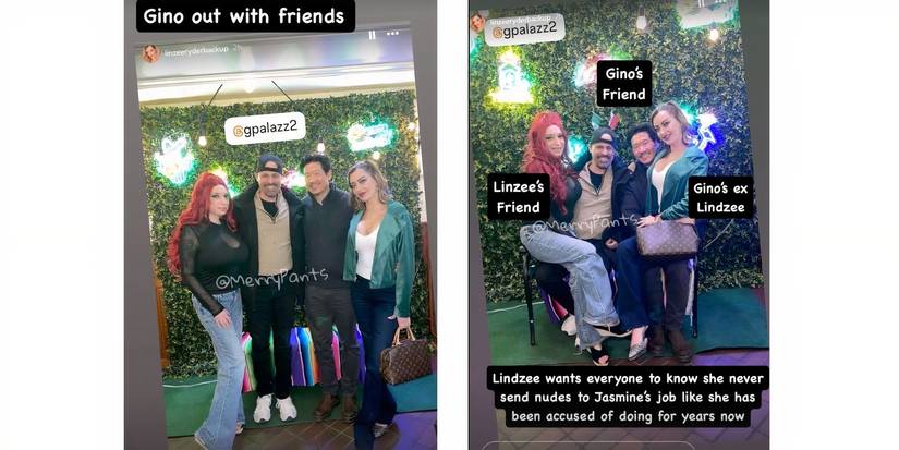 Gino se reunió recientemente con el ex-Linzee Ryderque es la misma mujer que había enviado un mensaje a Jasmine. Gino fue acompañado por una misteriosa mujer pelirroja, que, según Ferrypants Es el amigo de Linzee, y se sentó en el regazo de Gino mientras un amigo de Gino hizo que Linzee se sentara en su regazo. El nombre de Linzee nunca fue mencionado en el programa con su referencia como el ex de Gino. Sin embargo, Jasmine afirmó que perdió su trabajo de enseñanza en Panamá cuando Linzee le envió las mismas fotos en topless a su empleado. Linzee quiere que todos sepan que ella “nunca envió desnudos al trabajo de Jasmine,“El blogger agregó.