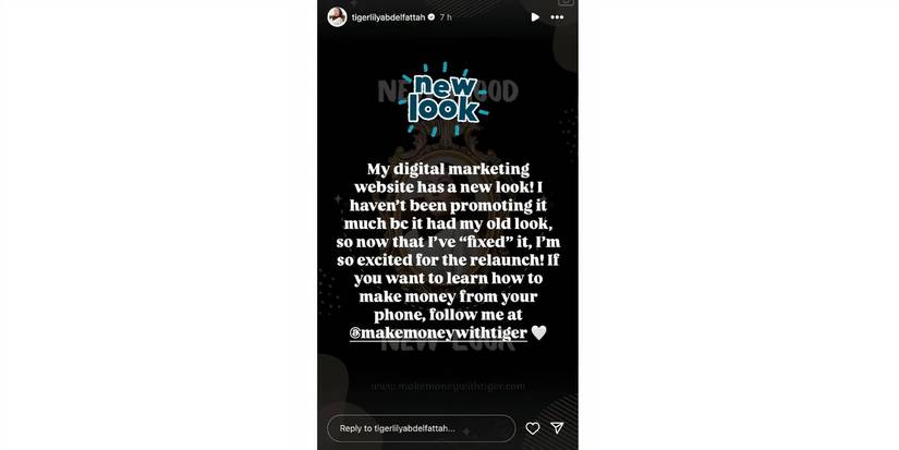 Tigre compartió una historia de Instagram con un GIF que decía: “Nuevo aspecto,“Y agregó que su sitio web de marketing digital ahora tenía un nuevo aspecto. Dijo que no lo había estado promocionando mucho”.porque tenía mi antiguo look,“Pero Tigerlily tenía “fijado” Ahora y estaba emocionado de relanzarlo. Ella le dijo a sus fanáticos que Si quisieran “Aprenda a ganar dinero con su teléfono,“Podrían seguirla en @makemoneywithtiger.
