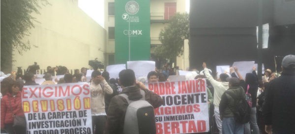 Los feligreses rezan y portan cartulinas en apoyo al sacerdote, quien se encuentra en prisión preventiva oficiosa en el Reclusorio Preventivo Oriente.