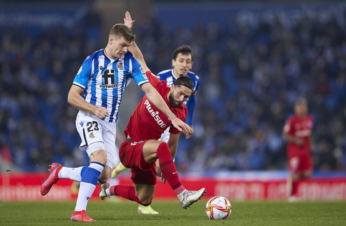 Trataban los madrileños de detener el vendaval realista por ambas bandas, indetectable Sorloth, que basculaba hacia los costados y abría espacios a sus compañeros. Antes de los cinco minutos ya había tenido Aihen un remate claro tras un gran pase cruzado desde la banda por Oyarzabal. Sin recuperarse del primer susto, se produjo el segundo, y fue ración doble de Januzaj, que recibió en el área un pase de Aihen. Remató la primera al cuerpo de Lodi; nadie fue a tapar el segundo disparo del extremo belga, que se marchó fuera por centímetros. La defensa del Atlético hacía aguas y ningún futbolista creativo de los de Simeone había entrado en calor todavía, todo un problema.