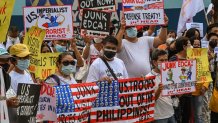 Manifestantes sostienen pancartas frente al cuartel general militar en Quezon City, el 2 de febrero de 2023, mientras el secretario de Defensa de EEUU, Llyod Austin, y su homólogo filipino, Carlito Galves, celebraban una reunión bilateral.