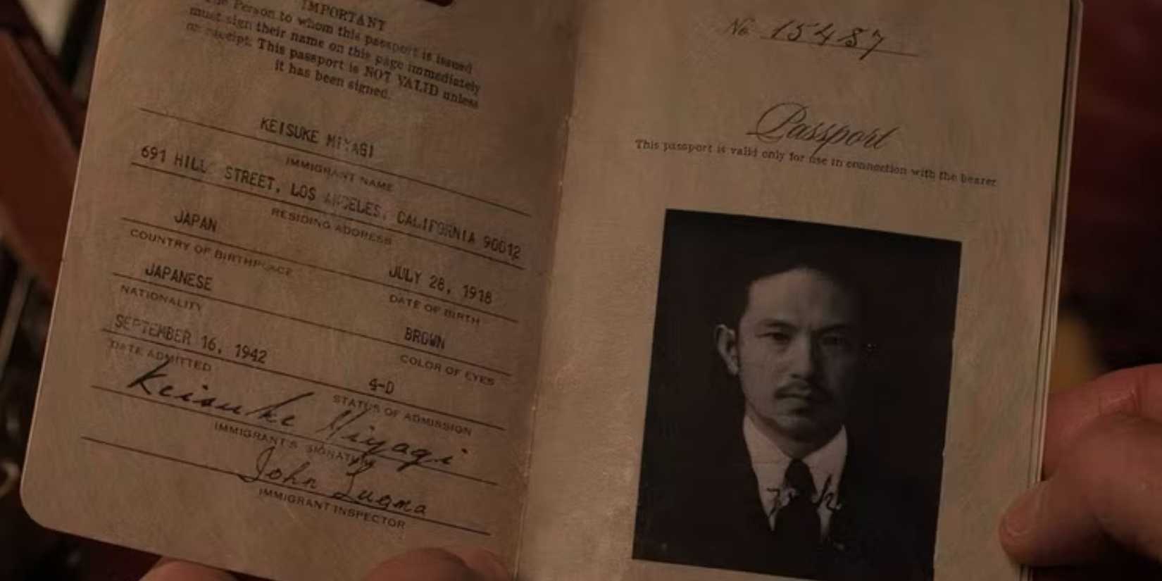 Como explicó la madre de Daniel, el Sr. Miyagi estaba tratando de recuperar el collar, que había pertenecido a su esposa, y antes de eso, su madre. Su esposa lo tenía cuando la detuvieron en un campo de internamiento japonés, y fue robada por uno de los guardias. Después de escuchar la historia, Daniel ahora entiende que la persona que el Sr. Miyagi golpeó en 1947 era el ladrón, lo que significa que su mentor era inocente de cualquier irregularidad.