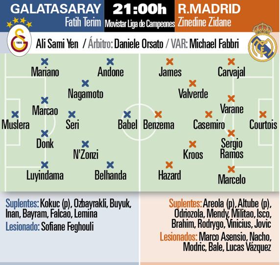 Para enfrentarse al Real Madrid, el Galatasaray cuenta con la baja del centrocampista argelino Sofiane Feghouli, por lesión.