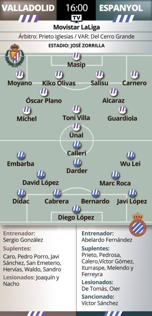 Se mide al Valladolid (está a cuatro puntos del descenso), un rival directo en la pelea por la permanencia y sólo le vale un resultado, la victoria. De ganar hoy los de Abelardo dejarían el farolillo rojo del campeonato y además, meterían en la pelea por la salvación al Valladolid, agravando su reciente mala racha. El Espanyol no puede salir de vacío de Pucela, no se lo puede permitir, ya que casi todos los rivales en la carrera por la salvación han puntuado (Celta y Mallorca) y debe aprovechar los pinchazo del Leganés y del Eibar. No queda otra para seguir soñando.