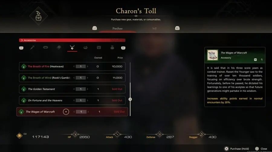El Testamento de Oro es otro de los primeros objetos comprados a Caronte en el Peaje de Caronte. Cuesta solo 5000 Gil y aumentará las recompensas de Gil en un 35%. Esto significa que se amortizará rápidamente después de unos pocos encuentros o misiones secundarias. Esto lo convierte en uno de los mejores accesorios para usar al principio. Fantasía Final 16La historia de, ya que puede aumentar exponencialmente los fondos totales.