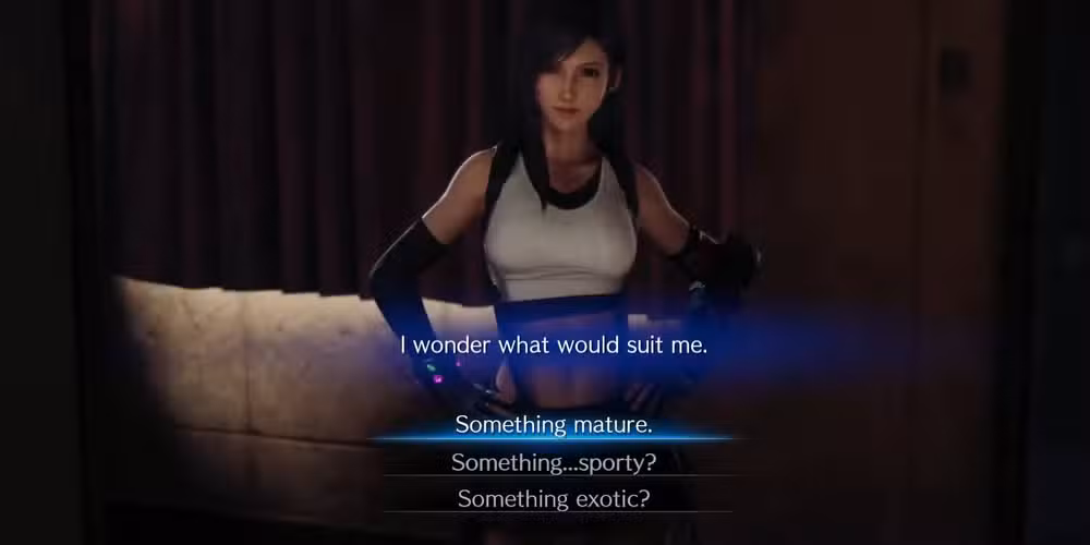 Esto pasa a un mensaje de diálogo para usted, donde debes elegir entre tres opciones diferentes. Esto puede parecer un comentario pasajero, pero en realidad afecta el tipo de vestido que usa cuando se dirige a la mansión de Don Corneo más adelante en el juego. Las opciones que Tifa ofrece para la nube son: