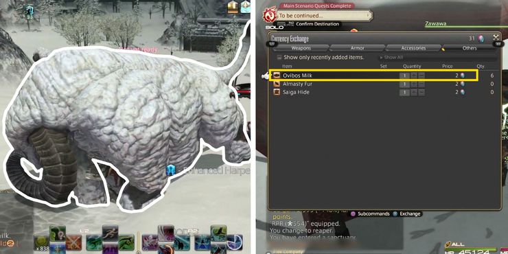 La última forma de obtener Leche de Ovibos en Fantasía final XIV es intercambiando Gemstones con Gemstone Traders. Las piedras preciosas se obtienen a través de DESTINO específicos, que se pueden completar infinitamente. Como resultado, las piedras preciosas son los mejores medios para cultivar lecheras. La leche de Ovibos se puede cambiar por piedras preciosas en Fantasía final XIV en los siguientes comerciantes: Zawawa en Garlemald en X:12.9, Y:301, Gadfrid en Old Sharlayan en X:12.8, Y:10.5 o Sajareen en Radz-at-Han en X:11.1, Y:10.1.