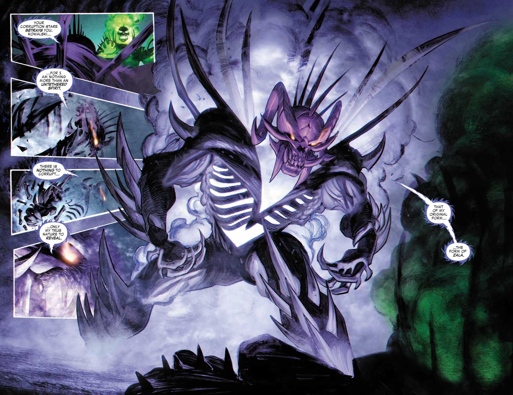 Incluso sin un anfitrión, Vengeance puede mantener cierto control corporal. cuando el finalmente se enfrenta a Kowalskiun concepto aún más oscuro villano del motorista fantasma quien tomó el nombre del primero después de que Badilino fuera convenientemente eliminado de los cómics y enviado al infierno, Vengeance renuncia a una pelea física. En cambio, el demonio ataca a Kowalski en un reino espiritual, revelando finalmente su verdadera forma demoníaca. Confesando su verdadero nombre, Zala, Vengeance domina a su oponente.. Envuelto por vapores de humo púrpura que sólo sirven para oscurecer las enormes púas óseas que sobresalen de su espalda, Zala es un pintoresco emisario del infierno.