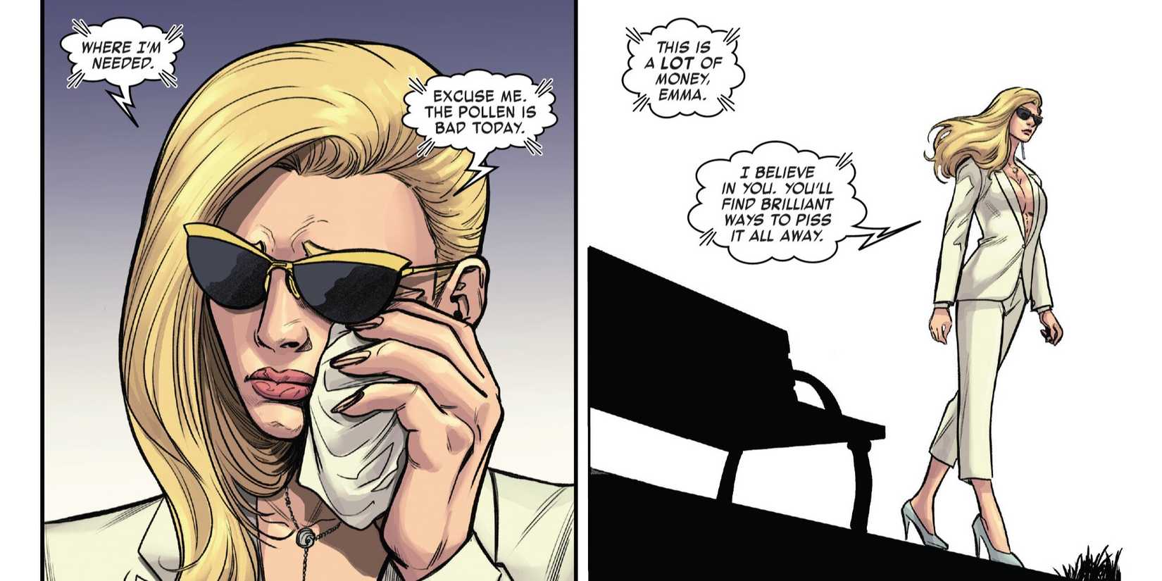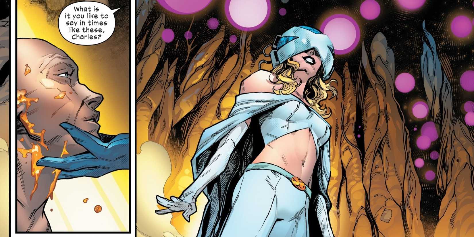 ha evolucionado gradualmente hasta convertirse en uno de los líderes más influyentes y heroicos de la raza mutante. Después de haber abandonado durante mucho tiempo la mayoría de sus costumbres manipuladoras e inmorales, Emma ha abrazado plenamente su papel moderno como heroína y maestra. Pero finalmente, Marvel está completando el viaje de la socialité mientras poco a poco acepta algo que ni siquiera Charles Xavier podría.