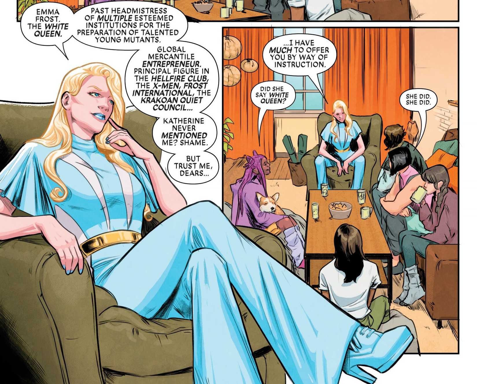 han hecho una asociación inesperada para darles a estos tres jóvenes mutantes la mejor educación de X-Men que podrían pedir. Sin embargo, mientras Kate quiere darles a estos niños un futuro sin peleas, Emma sigue creyendo que ese futuro no es posible. No es hasta que ella ve cómo Traicionado y desconsolado sus alumnos miran después de conocer el pasado de Kate, esa comprensión comienza a asimilarse. Ella cree que la próxima generación debería seguir presionando, especialmente después del trágico final de Krakoa, pero está perdiendo la fe en que luchar es la manera de hacerlo.
