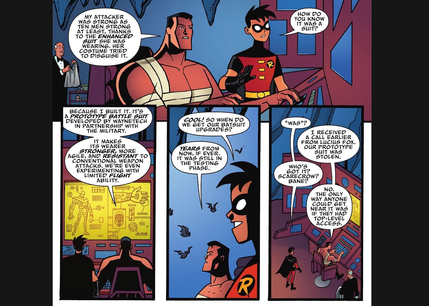 Aparece el primer indicio de que este prototipo robado es de hecho el traje Beyond Batman: Las aventuras continúan: Temporada 3, n.° 4, “Crack-Up!, Part 2″, cuando Batman le cuenta a Robin las capacidades del traje, diciendo: “Hace que quien lo lleva sea más fuerte, más ágil y resistente a los ataques con armas convencionales. Incluso estamos experimentando con una capacidad de vuelo limitada”. Los espectadores observadores pueden notar que la cara del traje en el lado derecho de la Batcomputadora se parece al ceño fruncido distintivo del traje de Beyond, pero solo en “Crack-Up!, Part 3” se ve el traje con todo detalle. No solo la cara coincide mucho más claramente con la del traje de Beyond, sino que el traje también tiene el esquema de color negro y rojo revelador del traje de Beyond. Como presagio adicional, incluso se coloca frente a la fila de los otros disfraces almacenados de Batman, Robin y Batgirl.