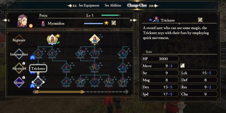 La clase Trickster es más adecuada para personajes que usan espadas y magia en Fire Emblem Warriors: Tres esperanzas, aunque también hay unidades específicas que son más adecuadas para la clase magistral. Siempre que los jugadores estén viendo una unidad en el menú Cambiar clase, las flechas azules hacia arriba indicarán que esas clases serán las más adecuadas para la unidad y también obtendrán estadísticas adicionales. Por ejemplo, el personaje de Petra en Fire Emblem Warriors: Tres esperanzas tiene estas flechas junto a las clases Thief, Assassin y Trickster, todas las cuales pertenecen al mismo árbol.