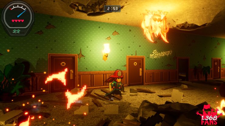 El jugador gana dinero al salvar a civiles durante las etapas y pierde dinero si Firegirl es KO durante una misión. Las personas que rescata a veces aparecerán como posibles contrataciones en Firehouse, que comenzarán a trabajar junto a Firegirl. Las contrataciones son esencialmente tiendas que venden actualizaciones, como aumentar la efectividad de los kits de salud o agregar tiempo al reloj en las misiones. Chica de fuego tiene un bucle de juego similar a infierno, con el dinero ganado de las misiones utilizado para facilitar gradualmente las cosas. Es un bucle adictivo y sirve Chica de fuego Bueno, como el combate, la exploración y las plataformas de ritmo rápido son muy divertidos, con el elemento del reloj que hace tictac mantiene al jugador alerta todo el tiempo. La naturaleza aleatoria de las etapas significa que el jugador nunca puede relajarse, ya que las rutas de escape pueden cortarse, lo que los obliga a seguir avanzando a través de las llamas.
