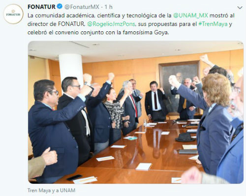 El rector de la Universidad Nacional Autónoma de México (UNAM), Enrique Graue Wiechers, y el director del Fondo Nacional de Fomento al Turismo (Fonatur), Rogelio Jiménez Pons, firmaron un acuerdo de colaboración para desarrollar actividades académicas, de capacitación, investigación, científicas, socioeconómicas y culturales en torno al Tren Maya.