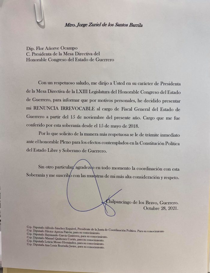 El fiscal general de Guerrero, Jorge Zuriel de los Santos Barrila, presentó este jueves su renuncia al Congreso estatal por cuestiones personales.