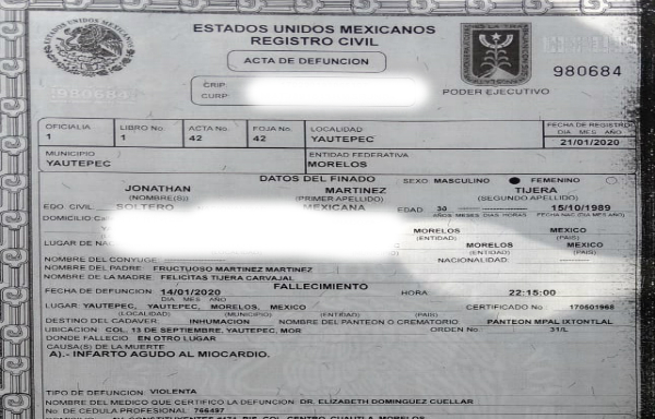 En Morelos personal del Servicio Médico Forense (Semefo) entregó el cuerpo de Jonathan Martínez Tijeras a su familia, quienes lo velaron y enterraron. Dos semanas después apareció vivo. Ahora la familia exige a las autoridades que compongan la situación debido a que legalmente Jonathan está muerto.
