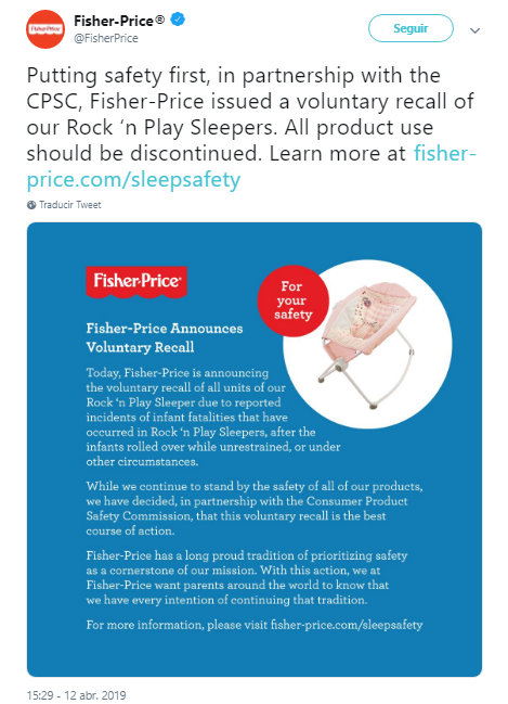A partir del 12 de abril, en un comunicado a través de Twitter, se anunció “el retiro voluntario de todas las unidades del ‘Rock’n Play Sleeper’ debido a los casos reportados de muertes de niños mientras se encontraban en el columpio ( …) sin estar atados”.