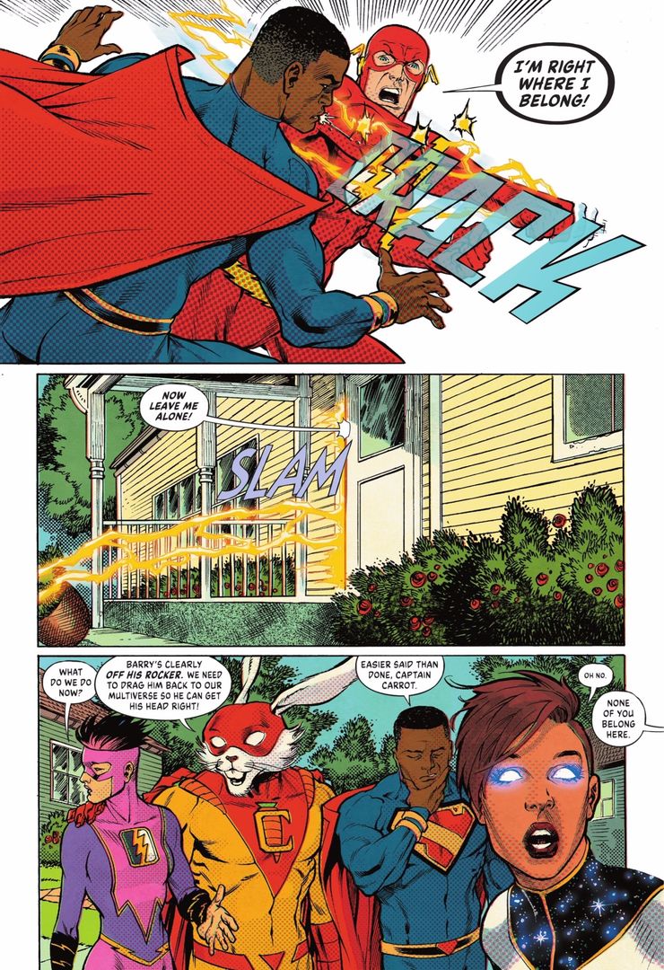 Cuando la Liga de la Justicia Encarnada logra atravesar el portal, se encuentran en un suburbio tranquilo donde Barry Allen está vestido con su traje completo de Flash cortando el césped de la casa de su madre. Si bien es cortés al principio, Flash se frustra gradualmente más con estos héroes multiversales cuando le dicen que el mundo en el que vive no es real y que necesita ir con ellos para salvar toda la realidad. En su ira, Flash golpea a Superman en la cara antes de acercarse a la casa de su madre a la velocidad de la luz. Después de que Flash lanza el gancho de derecha, se muestra a Superman frotándose la mandíbula con dolor, lo que indica que el golpe que lanza Flash realmente lo ha lastimado. Si Flash puede causar dolor a Superman, incluso el más mínimo dolor, con un solo golpe, entonces presumiblemente puede derribarlo si le da miles de golpes por segundo, lo cual está dentro de sus habilidades.