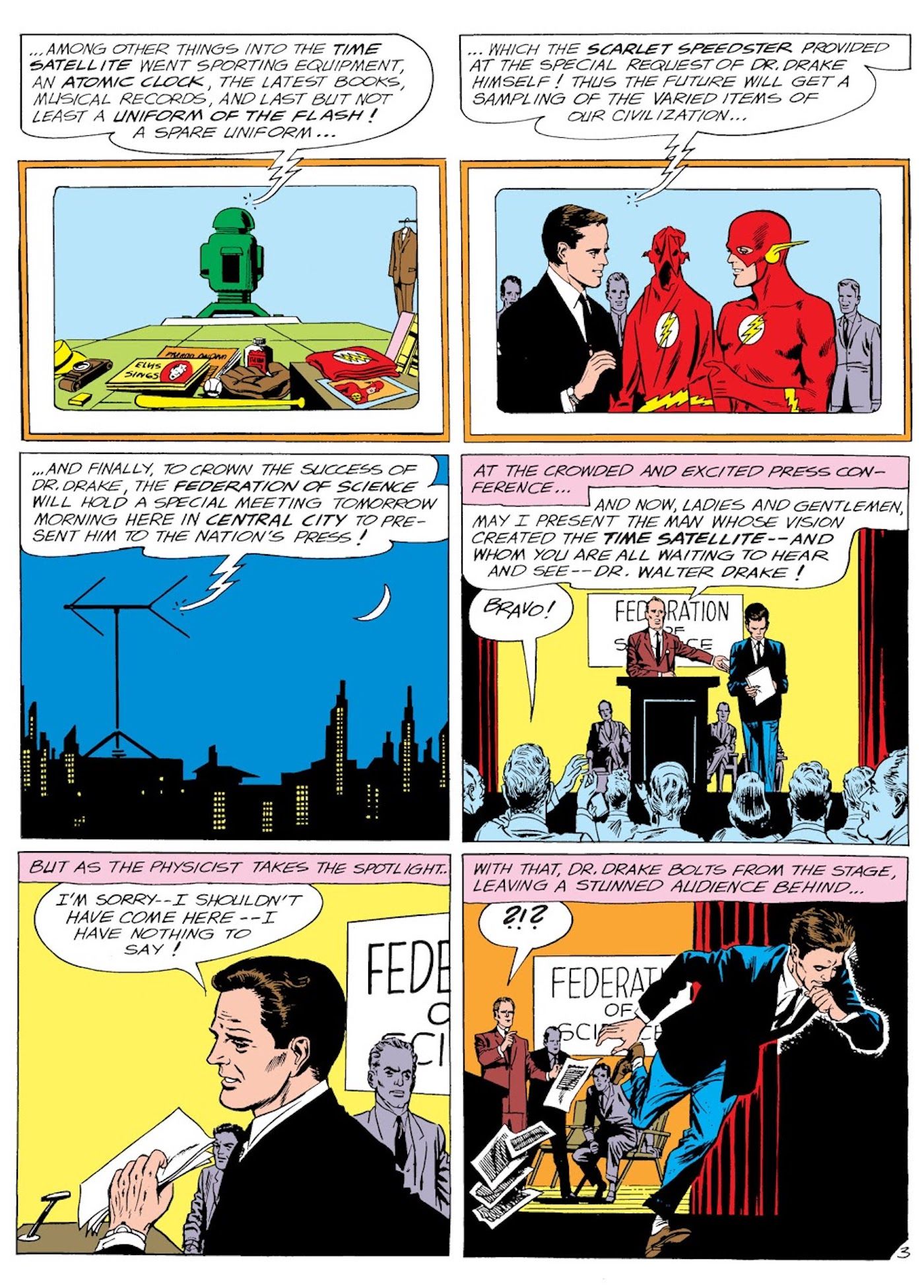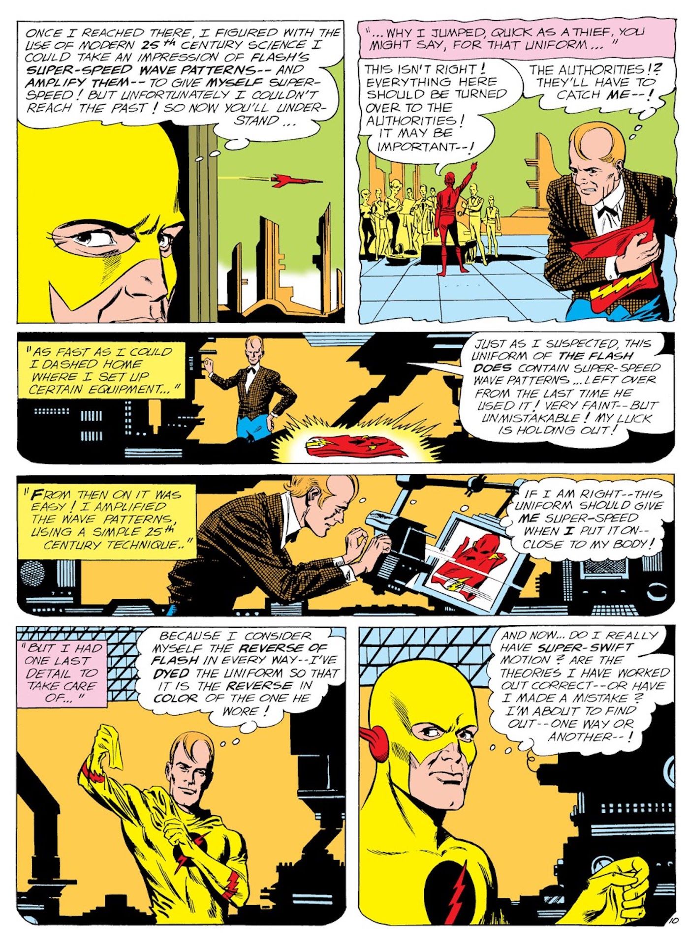 El origen original de Eobard Thawne se ve por primera vez en 1963 El relámpago #139 de John Broome y Carmine Infantino. Este número muestra a Flash asistiendo a una ceremonia para enviar un cohete al futuro. Como una cápsula del tiempo inversa, en lugar de enterrar algo y desenterrarlo más tarde, los científicos simplemente envían directamente una colección de elementos al futuro, uno de los cuales es el viejo traje de Flash. Pero lo que nadie podría haber predicho es el hecho de que enviar el traje de Barry al futuro crea Reverse Flash. Eobard Thawne es un criminal promedio conocido como “El Profesor” y cuando ve el cohete, corre hacia él y agarra todo lo que puede, como suelen hacer los criminales. Una cosa que agarra es el traje de Barry. Si bien Eobard es un criminal promedio, es un científico brillante y, al usar el traje de Flash, puede extraer los poderes de velocidad de Flash y usarlos para sí mismo.