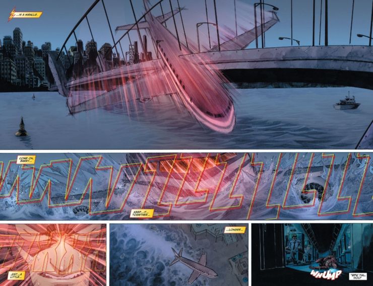 Mientras que la escena del avión de The Boys está sumida en el nihilismo, Flash optó por una ruta más optimista. En El relámpago #3 por Francis Manapul y Brian Buccellato, una misteriosa oleada de energía ha sumido a Central City en la oscuridad absoluta. Si el apagón no fue lo suficientemente malo, un avión se dirige directamente a una colisión con un puente y Flash de Barry Allen es el único que puede detenerlo. Barry usa su velocidad para lanzarse desde el suelo y subir al avión. Mientras lo hace, detalla las cosas asombrosas que su conexión con Speed Force le permite lograr. Barry recuerda cómo accidentalmente aprendió a pasar a través de la materia sólida después de beber un espresso. Con eso en mente, Flash se conecta al avión y hace vibrar tanto las moléculas del avión que el avión atraviesa completamente un puente y aterriza de manera segura en el agua.
