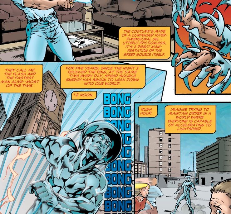 Unos meses después, en El Flash # 131, este traje de ensueño sería revisado y hecho realidad. Este número contó con el equipo creativo de Mark Millar, Grant Morrison, Paul Ryan, John Nyberg, Tom McCraw y Gaspar Saladino. Wally se enfrenta a un enemigo diferente, conocido como el Traje, pero su encuentro inicial da como resultado que el superhéroe se rompa las piernas. Sin embargo, Flash recuerda su encuentro con Key y comienza a preguntarse si el traje Speed Force de su sueño podría convertirse en realidad. Considera las implicaciones de si pudiera “moldear la fuerza de velocidad viviente alrededor de mi cuerpo y hacer … una armadura de supervelocidad.“Podría permitirle moverse de nuevo, a pesar de sus graves lesiones en las piernas.