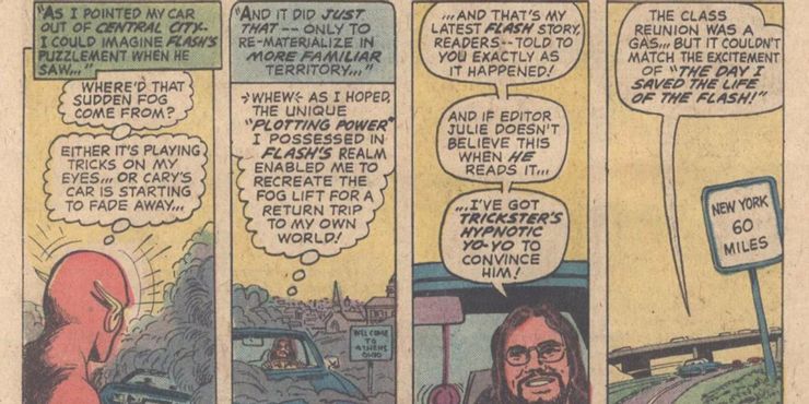 En El flash # 228 por Cary Bates, Irv Novick y Tex Blaisdell, el escritor del número, Cary Bates, viajó al mundo ficticio de Flash cuando ingresa a Central City. Al darse cuenta de que ya no está en su realidad, Bates ve al villano Trickster robando un banco y decide ayudar a Flash a acabar con él. Cary Bates no solo sabe todo sobre Flash desde que fue él quien escribió el cómic, sino que cuando viaja al mundo de Flash se da cuenta de que tiene un poder divino sobre él.