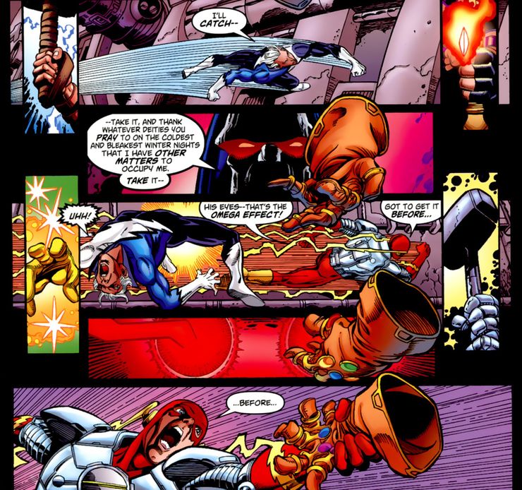 En el crossover Avengers / JLA, Flash enfrentó el poder del Infinity Gauntlet, lo que lo motivó a ser más rápido que el Quicksilver de Marvel.
