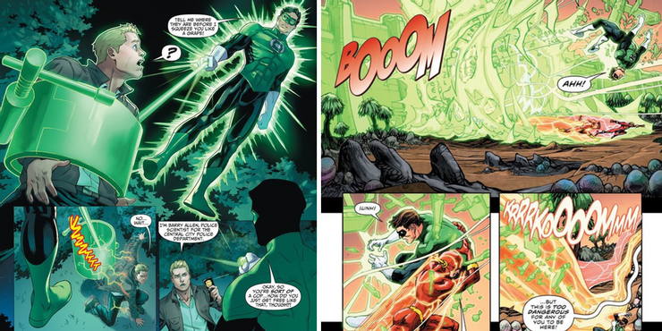 Este récord contra villanos similares establece el patrón para momentos directos de Flash vs Green Lantern. En estos enfrentamientos, Flash tiende a superar a Hal Jordan, ya sea como resultado de su comprensión de las habilidades de un Green Lantern, o por la incapacidad de Jordan para compensar las fortalezas de Scarlet Speedster. En 2009 El Flash: Renacimiento # 3, el Flash escapa de la construcción de contención de Jordan con poco esfuerzo al vibrar a la frecuencia correcta para atravesarlo. Vuelve a repetir esta hazaña en 2012. The Flash Annual # 2, donde Green Lantern pone a Barry Allen en un tornillo de banco y amenaza con “Aplastarlo como una uva” si se resiste, solo para que Flash escape sin esfuerzo.