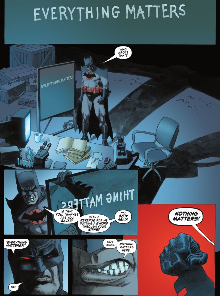 Habiendo dicho eso, Punto de inflamación más allá de #0 ve a Thomas despertándose en la línea de tiempo de Flashpoint que de alguna manera ha sido restaurada. Si bien aún no se ha presentado una explicación completa, es probable que tenga que ver con el actual Frontera infinita reiniciar. Por ejemplo, Thomas encuentra una pizarra como las que dejó el famoso viajero en el tiempo Rip Hunter. Si bien suelen estar llenos de pistas y adelantos sobre el futuro, la pizarra de Thomas Wayne solo tiene dos palabras: “Todo importa.“Naturalmente, Thomas se niega a creer en esta oscura verdad. Lo último que quiere es que su realidad sea real donde su hijo fue asesinado y su esposa se convirtió en el Guasón en su dolor (todo mientras su mundo está al borde de la guerra entre Atlantis de Aquaman y Amazonas de Wonder Woman).