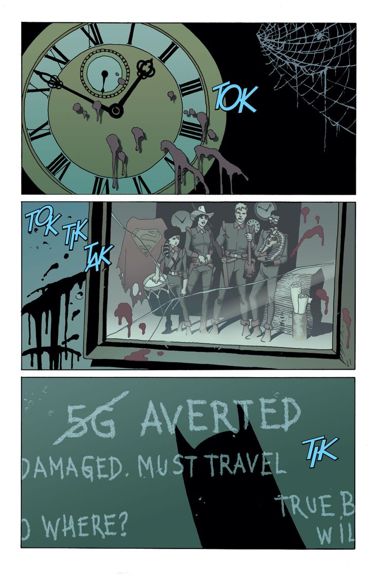 La vista previa comienza con Earth-0 Batman en el laboratorio de Rip Hunter. No dice nada, simplemente se mueve por el laboratorio, examinándolo cuidadosamente. Entre los objetos que mira están la burbuja de tiempo de Rip Hunter, imágenes salpicadas de sangre y las notas de Hunter, que se muestran en una pizarra; Batman también encuentra el cuaderno de Rip Hunter. Tanto la pizarra como el cuaderno contienen frases crípticas. Algunas de las frases dicen: “su hija se reincorporará a la Sociedad de la Justicia para salvarla” y “cuidado: encontrará a su hijo. No interfieras.” El significado exacto de estas frases solo lo conoce Hunter, aunque parecen presagiar eventos futuros.