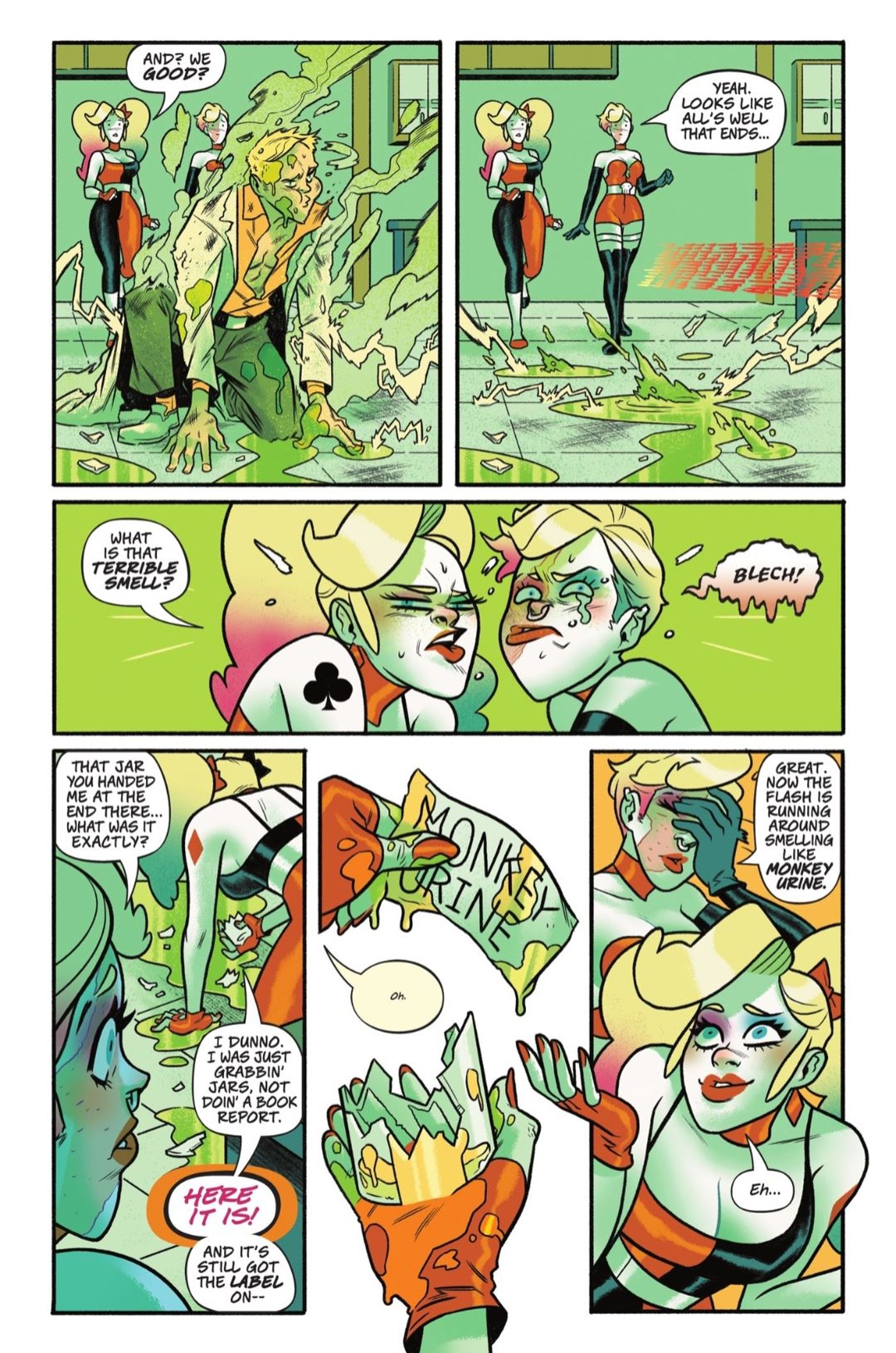 Para asegurarse de que Barry no muera por un rayo, el dúo retrocede en el tiempo para asegurarse de que los viales no se rompan antes de tiempo y los colocan en el lugar correcto. Sin embargo, Harley accidentalmente coloca un recipiente adicional en el estante junto con la otra cristalería. Barry es golpeado por un rayo y toma su baño químico, pero las Harleys rápidamente se dan cuenta de que algo salió mal cuando un mal olor les llega a la nariz. Aparentemente, la Harley original agregó accidentalmente un frasco de orina de mono a la colección de químicos de Flash.